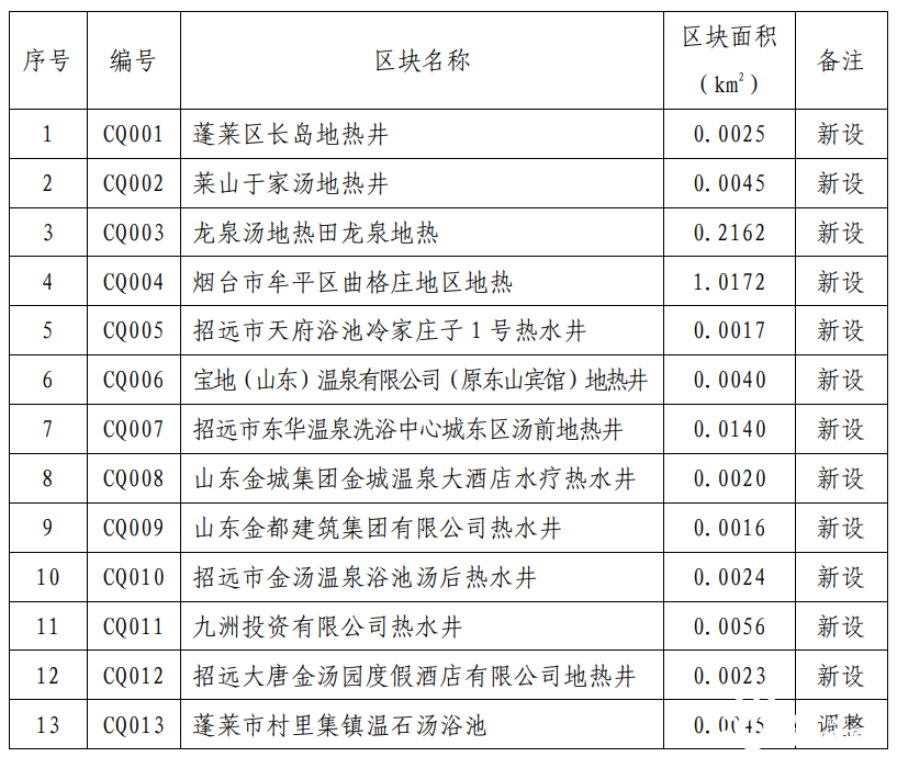 規(guī)劃期內(nèi),共設(shè)置地?zé)峥辈?/a>區(qū)塊2處,分別為山東省棲霞市惠禾·艾山地區(qū)地?zé)?/a>普查和山東省棲霞市長春湖·霞光地區(qū)地?zé)崞詹?,投放時(shí)間為2022年。規(guī)劃地?zé)嶂攸c(diǎn)開采區(qū)1處,位于招遠(yuǎn)市東湯地?zé)崽?/a>。重點(diǎn)開采區(qū)內(nèi)要嚴(yán)格按照開采規(guī)劃區(qū)塊優(yōu)先投放采礦權(quán),鼓勵(lì)支持礦山企業(yè)整合重組,優(yōu)化開發(fā)布局,提高資源利用效率。