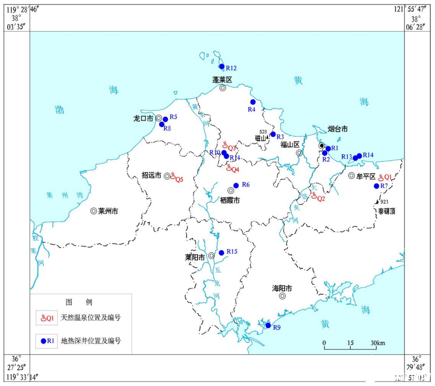 煙臺(tái)市地?zé)崽?/a>多以點(diǎn)狀形式出露在兩組或者多組斷裂交匯帶附近,屬于低溫開放式對流型帶狀熱儲(chǔ)地?zé)崽?/a>。目前,煙臺(tái)市共有天然溫泉5處、地?zé)?/a>深井15處。煙臺(tái)市已查明地?zé)崃黧w可開采量約650萬立方米/年,熱資源量為1.65×10^15焦耳/年,相當(dāng)于標(biāo)準(zhǔn)煤5.62萬噸/年。