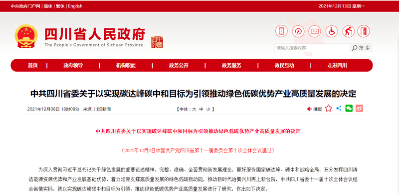12月8日,中共四川省人民政府在官網(wǎng)發(fā)布了《中共四川省委關(guān)于以實(shí)現(xiàn)碳達(dá)峰碳中和目標(biāo)為引領(lǐng)推動(dòng)綠色低碳優(yōu)勢(shì)產(chǎn)業(yè)高質(zhì)量發(fā)展的決定》(以下簡稱《方案》)。