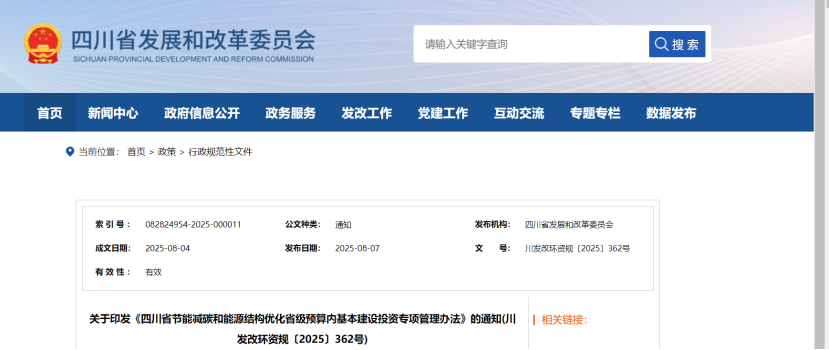 8月7日,四川省發(fā)展和改革委員會發(fā)布關(guān)于印發(fā)《四川省節(jié)能減碳和能源結(jié)構(gòu)優(yōu)化省級預(yù)算內(nèi)基本建設(shè)投資專項管理辦法》的通知(川發(fā)改環(huán)資規(guī)〔2025〕362號)。