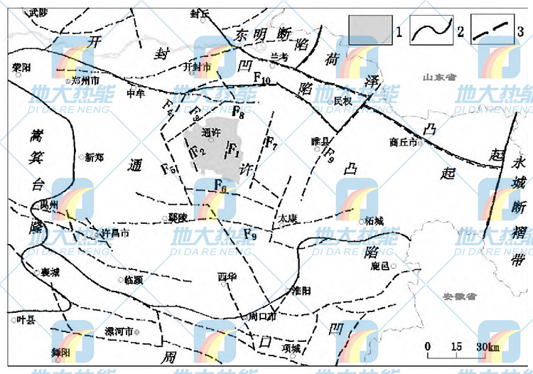 通許隆起大地構(gòu)造屬巨型秦嶺緯向構(gòu)造帶的東端和新華夏系第二沉積帶的復(fù)合部位, 屬嵩箕山脈的東延。北為開封凹陷及荷澤凸起, 南為周口凹陷, 西至嵩箕臺(tái)隆, 東鄰永城斷褶帶。隆起內(nèi)EW、NE、NW向三組斷裂將基底切割成破碎的斷塊狀, 局部形成新生代小斷陷。通許縣由于處于隆起區(qū)中部 , 斷裂構(gòu)造不發(fā)育, 對(duì)該區(qū)地?zé)?/a>形成有一定影響的斷層有四所樓-練成斷裂 (F1) 、豎崗斷裂 (F2) 、半坡—水坡斷裂 (F3) 、崔橋斷裂 (F6) 、杞縣斷裂 (F7) 、中牟—開封斷裂 (F10) 。