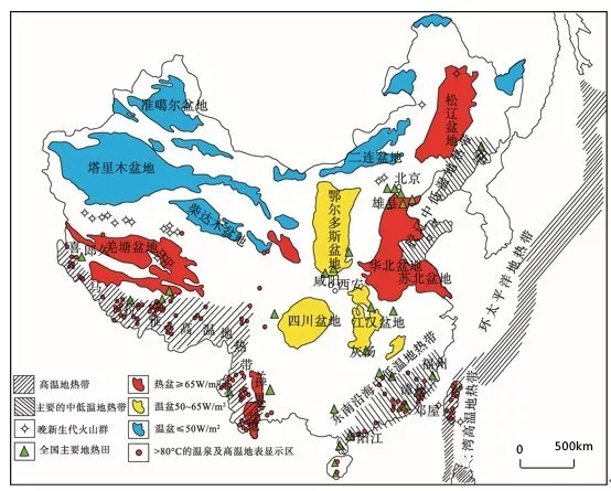 中國東部,高地溫梯度異常區(qū)多分布于松遼盆地、華北盆地及東南沿海地區(qū),地溫梯度多在4-5.°C/100m,最高可達7-8°C/ 100m,其分布多呈條帶狀,北東向延伸同地溫分布規(guī)律一致。