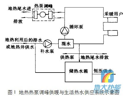 以往計算分析說明[:地?zé)?a href="http://m.cancere.cn/t/熱泵.html"  >熱泵供暖系統(tǒng),以地?zé)峒?a href="http://m.cancere.cn/t/熱泵.html"  >熱泵調(diào)峰供暖方式的供暖成本和投 圖1地?zé)釤岜?/a>調(diào)峰供暖與生活熱水供應(yīng)系統(tǒng)示意圖資低于熱泵單獨作熱源的供暖方式。
