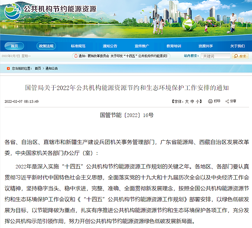 地大熱能清潔低碳能源網(wǎng)訊:國管局發(fā)布《關(guān)于2022年公共機(jī)構(gòu)能源資源節(jié)約和生態(tài)環(huán)境保護(hù)工作安排的通知》。通知指出,全面落實(shí)節(jié)能降碳有關(guān)工作: