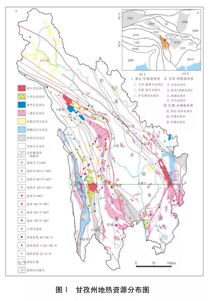 據最新調查成果,甘孜州的水熱活動強烈,全州共有溫泉點264 個,地熱井17 口, 除色達縣外,其余17 縣均有水熱活動。 全州溫泉分布主要受 3 條深大斷裂帶和數條主要大斷裂(德格-鄉(xiāng)城大斷裂帶、玉科大斷裂帶、 陳支大斷裂帶等)控制,形成了3個主要地熱帶和9個水熱活動集中分布區(qū)的基本分布格局。水熱活動強烈區(qū)一般位于主干斷裂帶及其轉 折的部位,以康定縣、甘孜縣、理塘縣、巴塘縣 為典型代表。