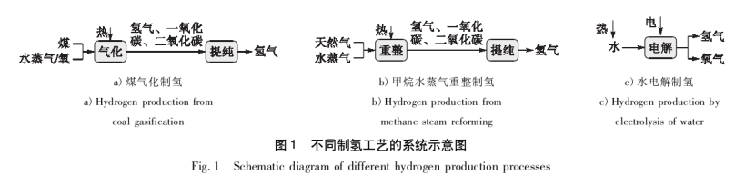 水電解工藝中ALK和PEM制氫工藝對溫度要求較低,技術(shù)成熟,但SOEC制氫工藝的工作溫度較高(約 900℃),目前處于產(chǎn)品試驗階段。電能可由太陽能、風(fēng)能、水力能和地?zé)崮?/a>等可再生能源獲取。水電解制氫只產(chǎn)生氫氣和氧氣,沒有二氧化碳排放,通常稱為綠氫,見圖1-c)。光解制氫工藝是利用太陽能的光熱來制取氫氣的前瞻性技術(shù)路線,包括太陽光催化分解水制氫、太陽光電化學(xué)分解制氫以及太陽能熱化學(xué)循環(huán)制氫,目前仍處于研究階段。